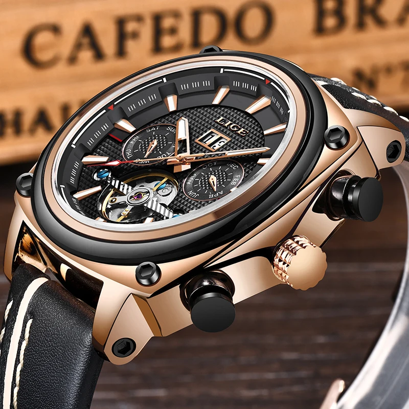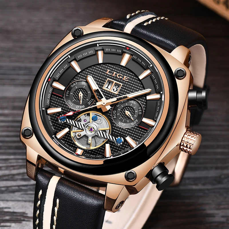 2019 New LIGE Mens Watches Top Brand Luxury Leather Tourbillon Automatic Mechanical Watch Men Water