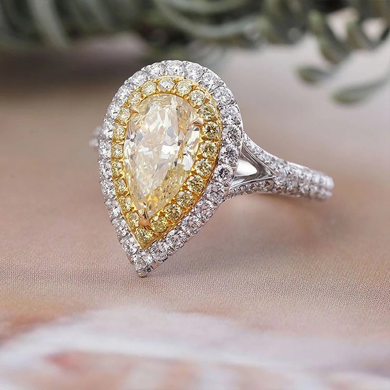 BEST Centre 1.5ct Pear Yellow Moissanite Ring Side Stones Yellow Moissanite Halo Ring Solid 18K White Go